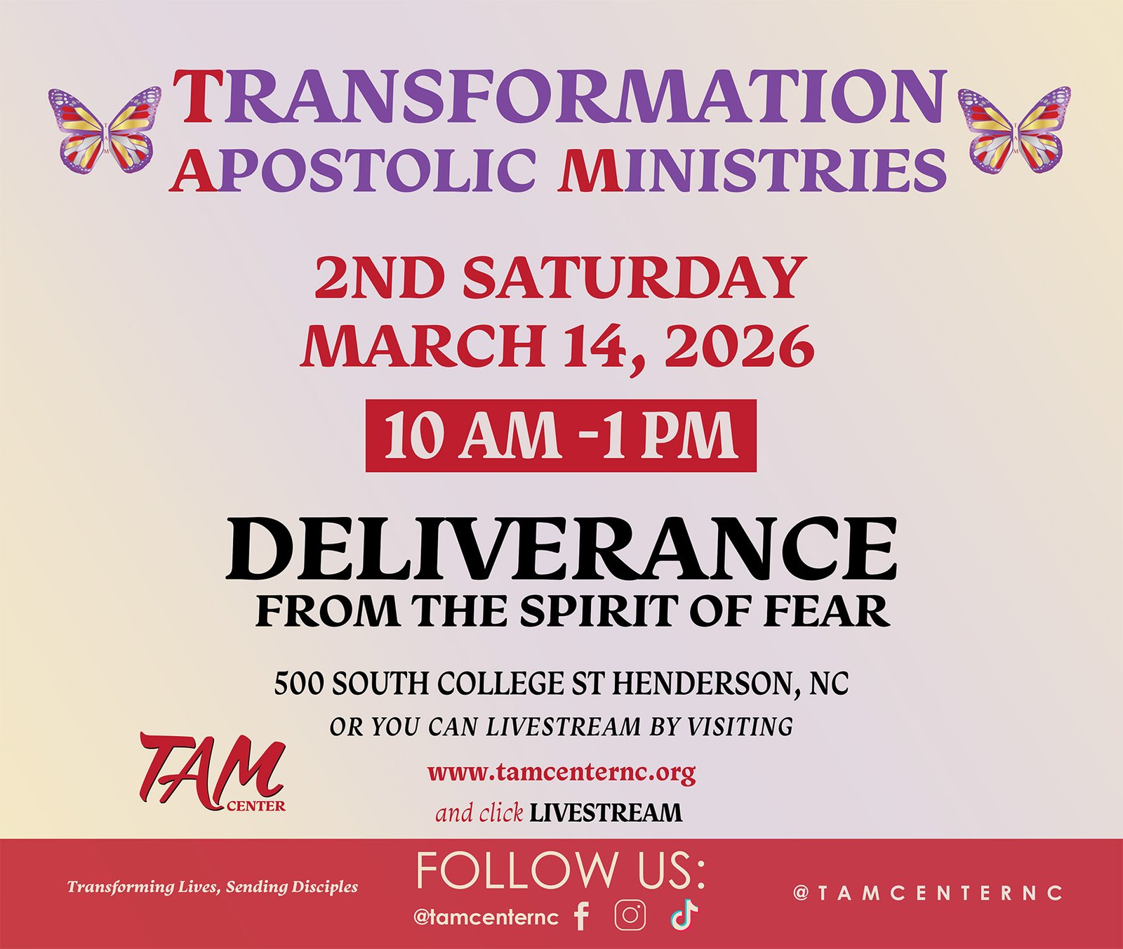 Join us on the 2nd Saturday in March at TAM, Transformation Apostolic Ministries, as we teach on Deliverance from the spirit of fear.