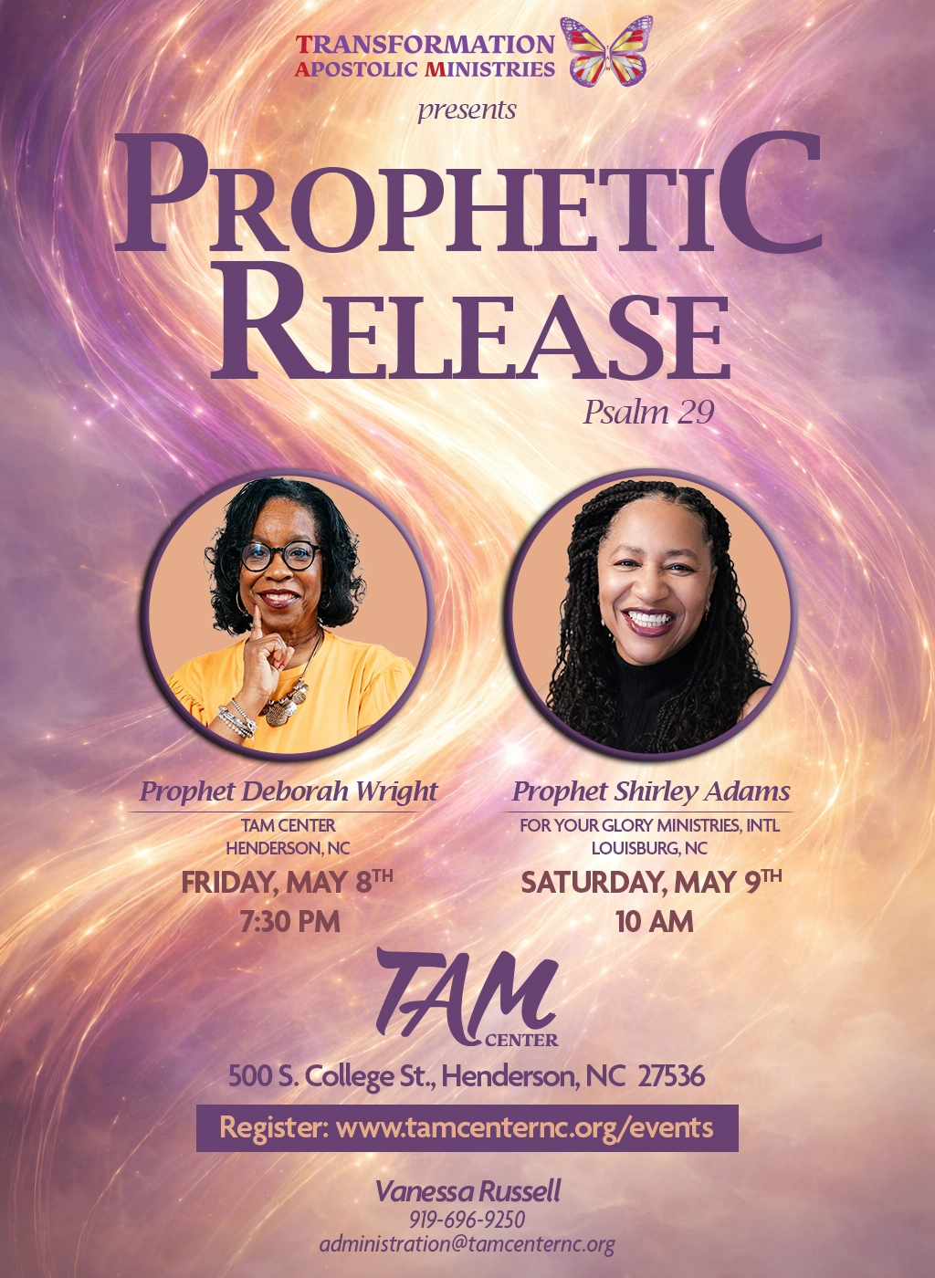 Join us on the 2nd weekend in May at TAM, for a Prophetic Release. Speakers are Prophet Deborah Wright and Prophet Shirley Adams of For Your Glory International. Registration is free. Come join us for a power Word from the Lord in this season.